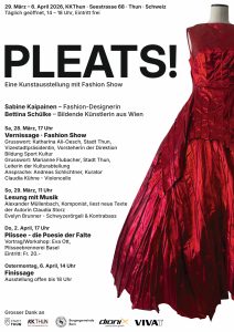 Samstag, 28. März – PLEATS, 17 Uhr, Vernissage Kunstausstellung Sabine Kaipainen und Bettina Schülke - Fashion Show von Sabine Kaipainen, KKThun - Musik: Claudia Kühne, Cello